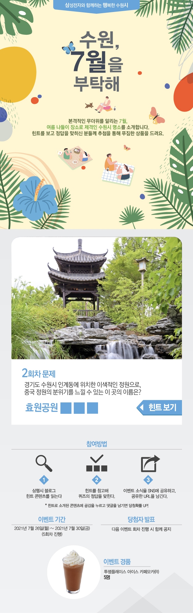 정보를 전하다/이벤트 [이벤트] 수원, 7월을 부탁해! (2회차) 2021. 7. 27. 08:00 해당 이벤트는 종료되었습니다 [1회차 당첨자 공지] 홍순*, *731 강형*, *714 성동*, *112 김유*, *872 김성*, *043 ※이벤트 당첨자 정보는 [이름, 전화번호 뒷자리 4자리] 형식으로 발표됩니다. ※수집한 개인정보는 개인보호정책에 의해 보호되며, 경품 발송 및 연락 외의 용도로는 사용되지 않습니다. 공유하기 게시글 관리 삼성전자와 함께하는 행복한 수원시 저작자표시 비영리 동일조건 (새창열림) 이런 콘텐츠 어떠세요? 정보를 전하다/이벤트 [이벤트] 수원, 7월을 부탁해! (4회차) 정보를 전하다/이벤트 [이벤트] 수원, 7월을 부탁해! (3회차) 정보를 전하다/이벤트 [이벤트] 수원, 7월을 부탁해! (1회차) 정보를 전하다/이벤트 [당첨자발표] 전통시장 나들이 ‘삼행시 마켓’