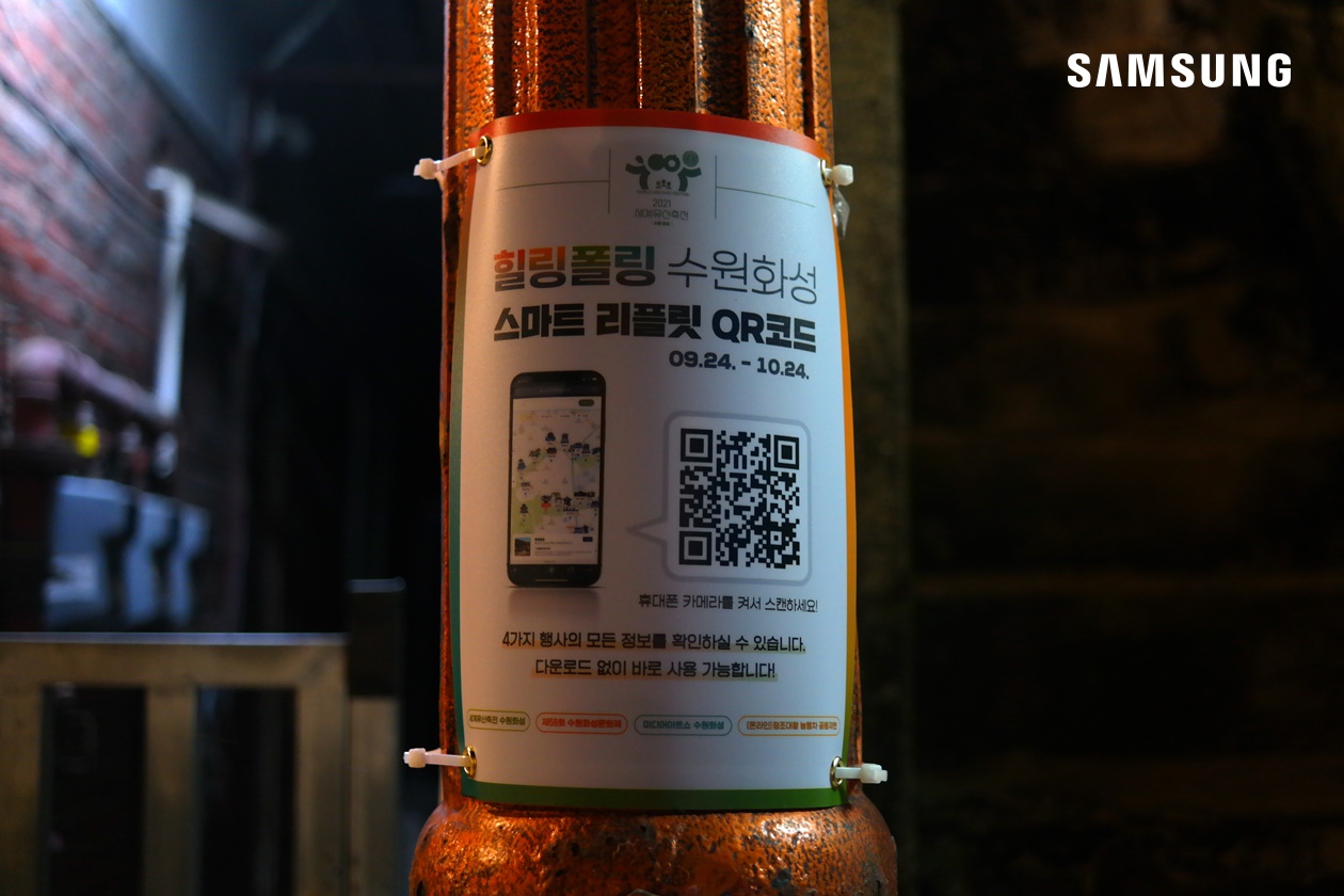 가을 데이트 장소는 물론 수원 야경 명소로 추천하는 행행산책로에는 ‘성안마을 미디어아트展’ 거리 전시회가 열리고 있습니다. 작품에 부착된 QR코드를 활용, 어플리케이션을 다운받으면 산책과 동시에 전시 설명을 들을 수 있는데요. 이번 성안마을 미디어아트展은 7팀의 뉴미디어 아트 작가들이 참여했습니다. 수원화성과 성안마을의 스토리를 재해석하여 제작한 미디어 설치 미술 작품들을 만날 수 있으니 꼭 방문하는 것을 추천합니다.